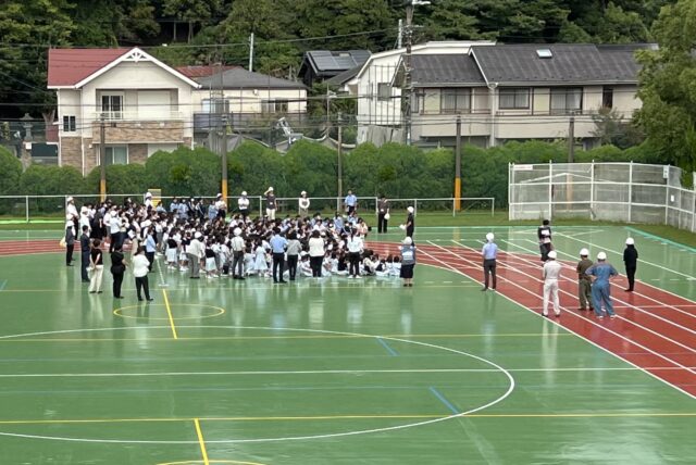 先週、火災避難訓練と不審者対応訓練がありました。1学期に行った地震・津波避難訓練に引き続き、「訓練のための訓練にならないように」をテーマに、今回は授業中ではなく休み時間に火災が発生という設定で行いました。※先生方にも「いつ」かは伝えませんでした。