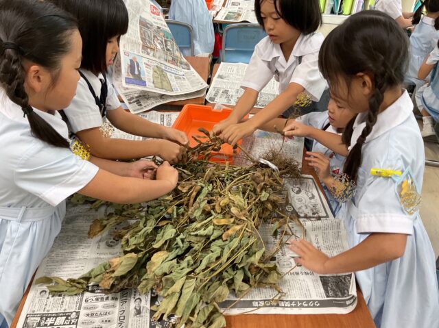 1年N組の子どもたちが、1学期から心をこめて育ててきたダイズは、いよいよ収穫の時期を迎えました。根っこから丁寧に抜いたダイズを干し、からからに乾いた莢を一つひとつ摘み取っていきます。そして、中から顔を出す豆を集めていく作業は数が多く、なかなか根気のいるものでしたが、子どもたちは協力し合いながら最後までやり遂げました。