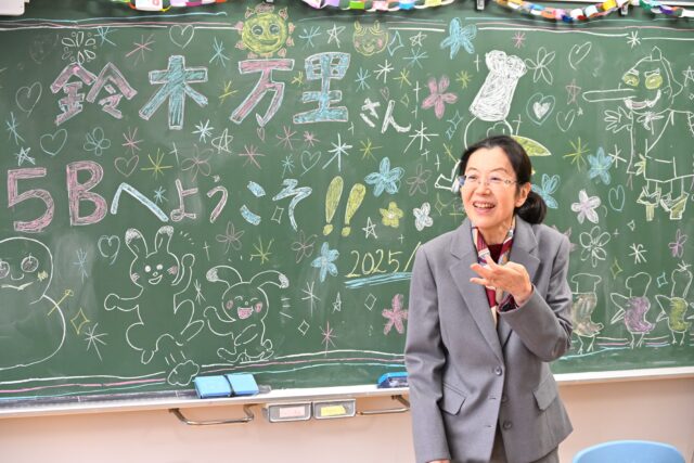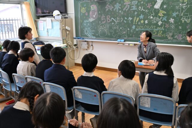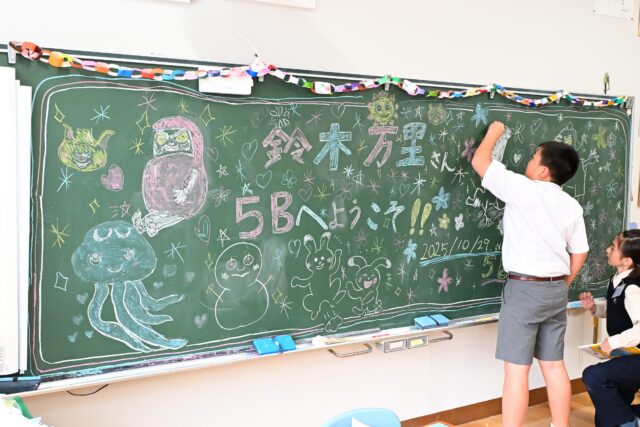 講堂でお話をうかがったあとは、5Bの子ども達が心を込めて準備をしてきた“鈴木万里さんをお迎えする会”を教室で開きました。だるまちゃんやからすの家族など、子どもたちが大好きなキャラクターが溢れる教室で、「くらげのパポちゃん」、「からすのパンやさん」、そしてかこさとしさんにについてなどの質問に丁寧に答えてくださいました。