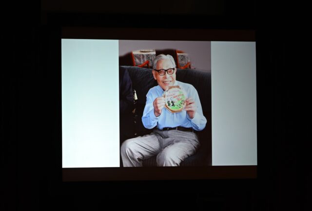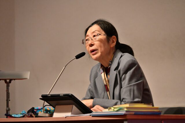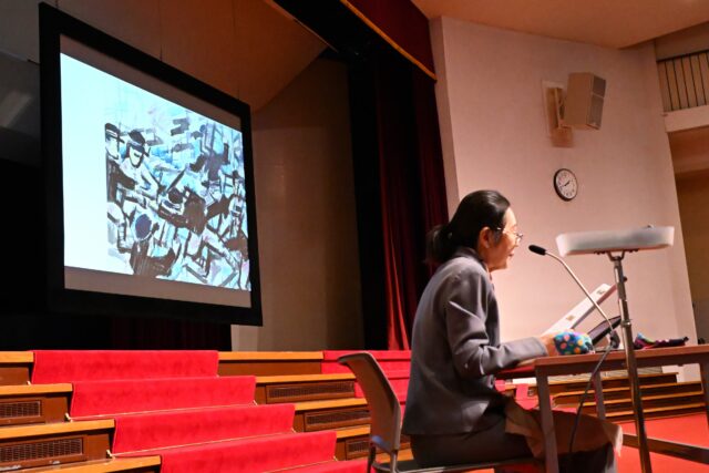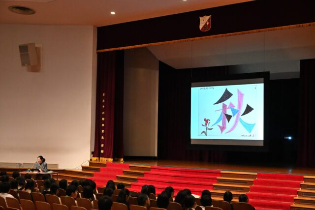 この日はまず講堂で、どんな出来事がかこさんの人生や作品に影響を与えたのか、また絵本作家としてどんな思いで作品を作っていらしたのかなどを、ご家族としての視点なども交えながらくわしくお話しして下さいました。