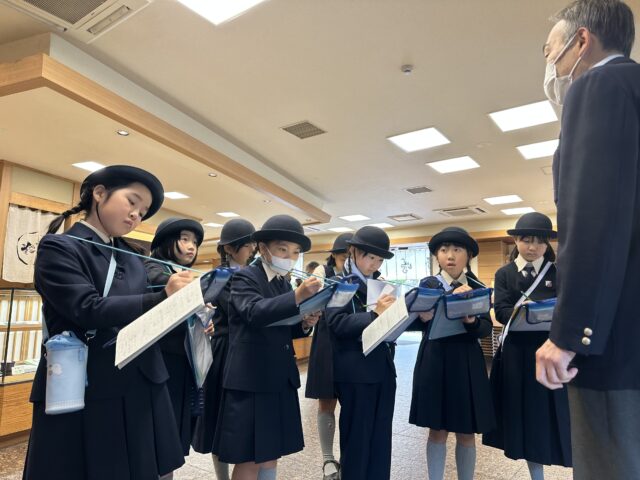 段葛は源頼朝が妻の北条政子の安産祈願のために造ったことや、一昔前までは一の鳥居から始まっていたこと、だんだんと道幅が狭くなり遠近法で参道が長く見えるように設計されていることなどを、算数の勉強をしながら学びました。