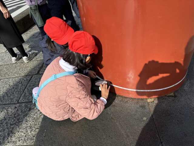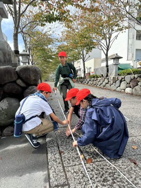 1つ目は若宮大路にある段葛の「長さ調べ」。算数「長さ(メジャー)」×総合の実践です。二の鳥居と三の鳥居の柱の太さと幅や、段葛の道の長さと幅を、20mメジャーを使い測りました。長いメジャーをお友だちと協力して、ぴんと真っすぐに伸ばしたり、0mに印をつけて繰り返し測ったり、何度測ったか正の字で数えました。