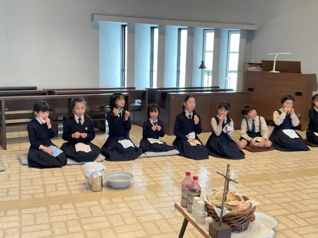 2月18日に四旬節に入ったこの時期に、イエス様が弟子たちに行われたことによってより深くイエス様が私たちを愛してくださったことを感じることができるようにと、洗足式に見立ててお互いに手を洗い合うこと、最後の晩餐で行ったように1つのパンを皆で分け合うこと、ぶどう酒(ぶどうジュースで行いました)を注ぎあうことをお聖堂で行いました。