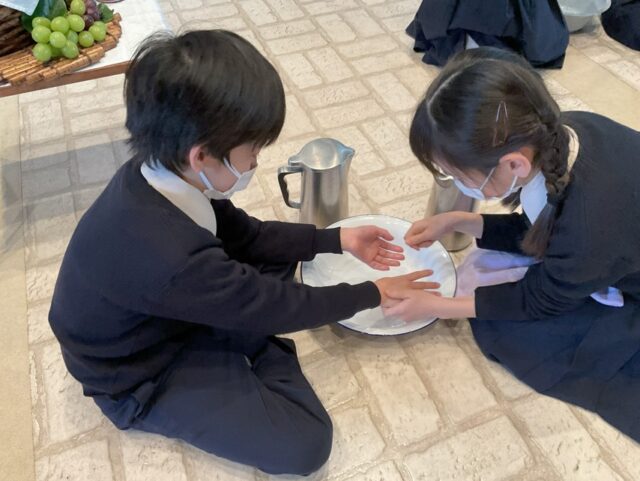 足を洗うときは、体をかがめなければ相手の足を洗うことはできません。それは、自分を高くするのではなく、自分を低くして神さまにも、相手にも謙虚な心をもつという意味があります。今回は手を洗い合いましたが、それは、お互いに身をかがめ合うことで平等を意味しています。
