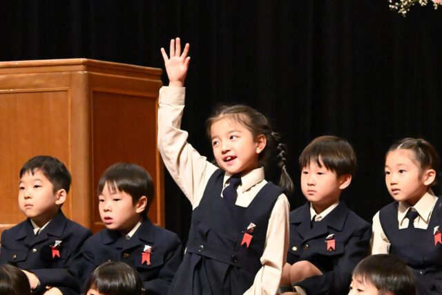 入学式の「1年生紹介」では、1年生が壇上に並び、担任から一人ひとりお名前を呼ばれて大きな声でお返事することができました。式に参列している在校生、保護者の皆様の温かい拍手に包まれて、緊張の中にも笑みがこぼれ、1年生になった喜びに溢れていました。
