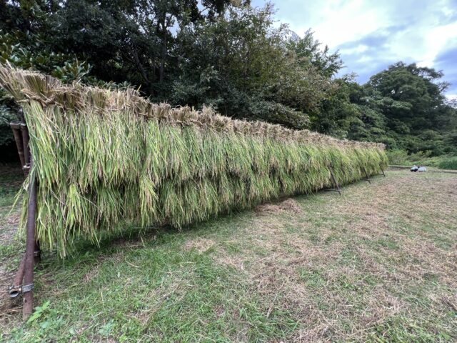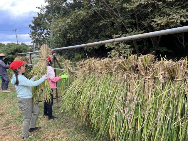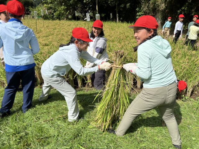 わら縄で縛った稲は、はさ掛けにしていきました。稲が乾燥したら、脱穀をし、冬にはお餅つきをする予定です。また、来年度入学する1年生のお祝いの紅白餅の原料にもなります。