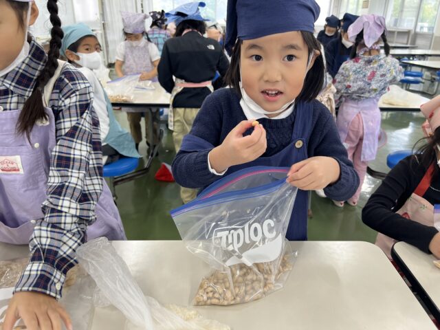 大豆をつぶす感触が気持ちよかったようで、楽しそうに混ぜていました。