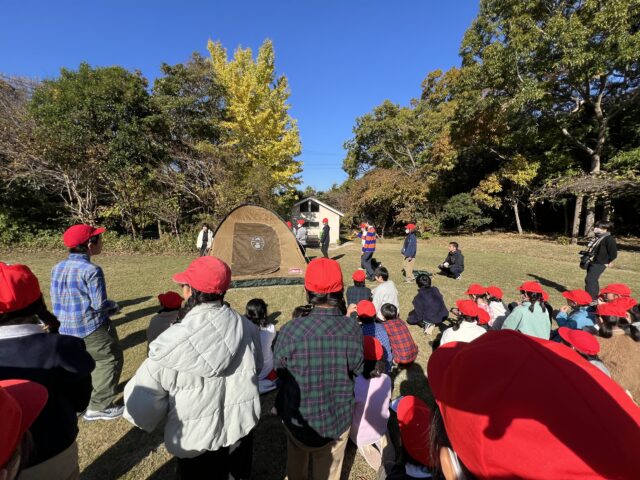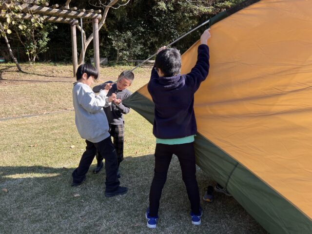 テントは、みんなで息を合わせて動かないと、うまく張れません。お友達と声を掛け合いながら、力を合わせて頑張っていました。