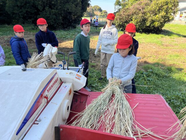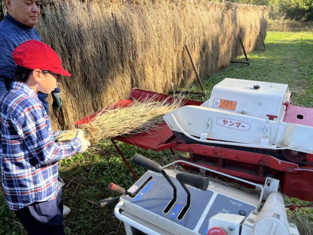 9月に収穫したもち米は、はさ掛けをして乾かしていました。子どもたちは、一束一束脱穀機に入れていきました。普段はなかなかできない体験に、興味津々でした。