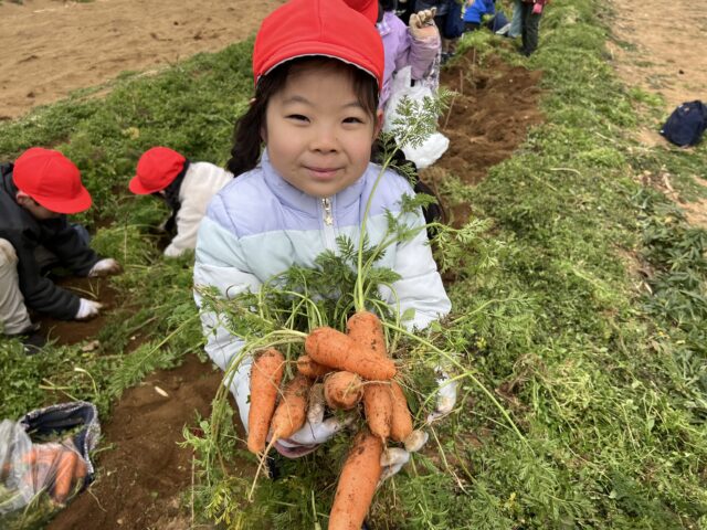 握り切れないくらい大きなもの、小指くらいの小さいもの、先が分かれてウサギみたいな形のもの、など、色々な形のニンジンに、子どもたちは大喜びでした。お友達と見せ合いながら、楽しそうに収穫していました。