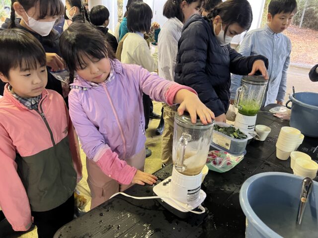 紙漉き体験の後は、子どもたちが持ってきたニンジンやキャベツ、みかんの皮などを使って紙を作りました。