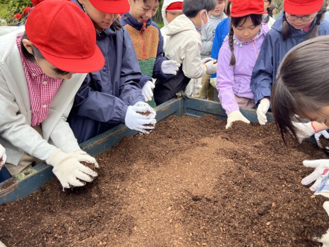 種まきの後は、田んぼに堆肥を撒きました。馬糞堆肥を実際に触り、匂いを嗅いだりもしました。次回は代かきをする予定です。