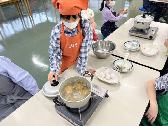 作物の活動の後は、家庭科の授業として、ゆでジャガイモとゆで卵づくりを行いました。