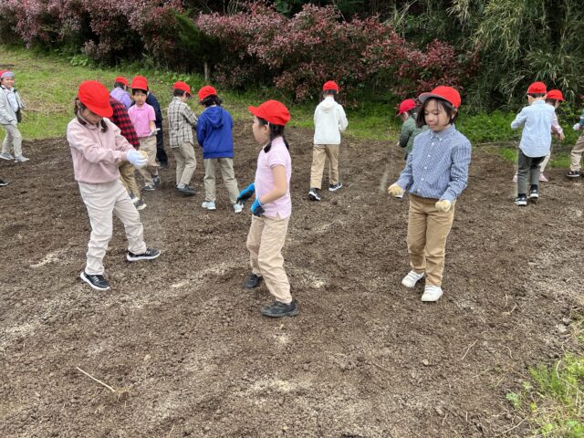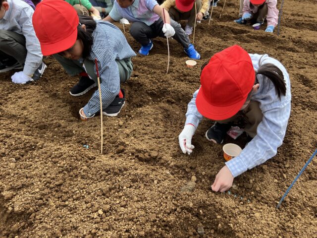 インゲンの種まきは、一人ひとり、種がどのくらいの大きさなのか、色は何色か、種をよく観察し、先生のお話をよく聞きながら、丁寧にまいていきました。
