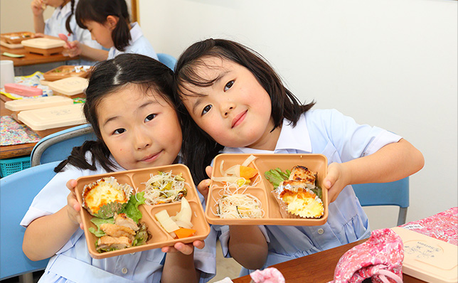 2023年度より週2回 火曜日・木曜日 希望制のスクールランチを導入しています。ランチ提供は、地元鎌倉の「仕出し弁当屋 舵屋」と「かまくらふれんず」です。当日調理されたお弁当は、清泉オリジナルランチボックスに詰められ学校に配達されます。旬の食材、栄養バランス、児童の好みも考慮しながら、さまざまな食材や調理法を取り入れて食の経験を広げています。素材の旨みが伝わる和食があったり、創立者の記念日には聖心待女修道会発祥の地スペイン料理があったりとバラエティに富んでいます。また、三浦キャンパスの畑で栽培した野菜を使った献立を児童が考え、これまでに枝豆チーズ春巻き、大根ステーキなどがスクールランチで提供され、種まきからごちそうさままでがつながる食育の実践を行うことができました。食の恵みへの感謝、おいしく楽しく健康的な食生活の基礎を育むよう努めております。